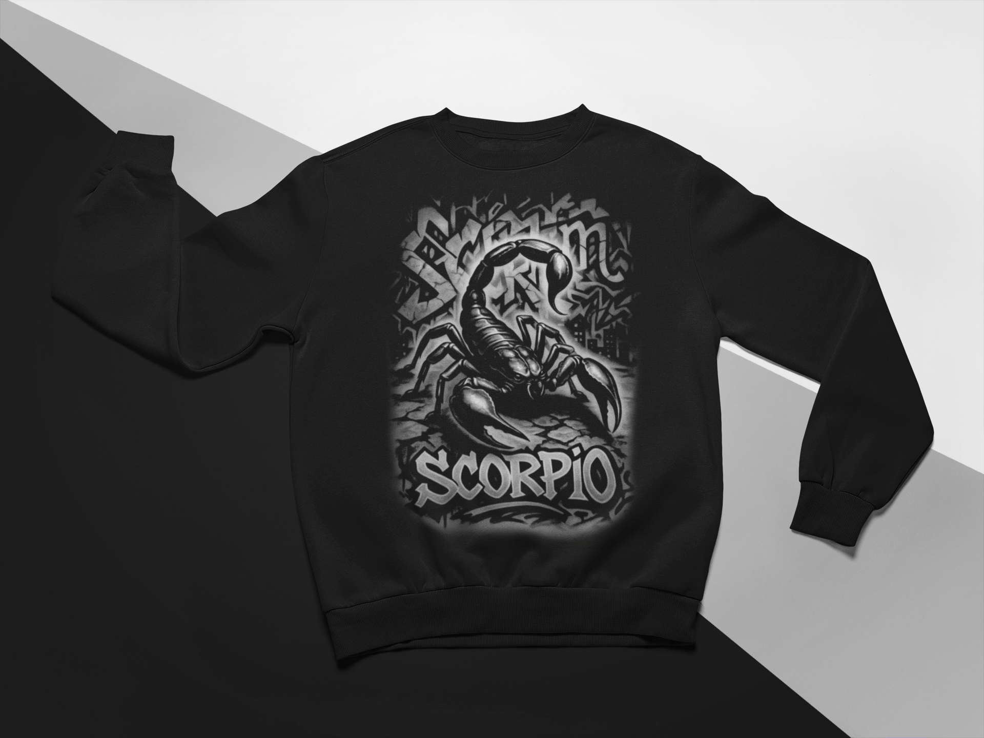 Turn up the heat in your zodiac wardrobe with this bold Scorpio crewneck. Designed with a striking black-and-grey graffiti aesthetic, this piece features a hyper-detailed scorpion emerging from an urban backdrop, complete with textured street-art elements and the iconic “Scorpio” tag across the bottom.